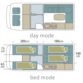設備 FF暖器系統 〇 冷凍冷藏冰箱 〇 附簡易馬桶的浴室 × 房間冷氣機 〇 多功能房間※1 〇 車內100伏特電源插座 〇 淋浴※2 〇 100V便攜式逆變器 × 附飲料架的大型桌子 〇 點煙器USB電源 〇 節能LED照明 〇 所有窗戶配有紗窗和百葉窗 〇 大型排風扇(可在雨天使用) 〇 附電動供水的水槽(冬季不可使用) 〇 電視 × 車內瓦斯爐 〇 微波爐 〇 三點式安全帶 〇 駕駛座智慧手機支架 〇 倒車攝影機(持續錄影) 〇 多言語対応多語言導航系統 〇 倒車聲納 〇 AM/FM收音機 〇 側邊遮陽篷(禁止使用) × ETC電子收費系統 〇 行車記錄器 〇 ※1 此空間可用作更衣室或儲物空間,亦可安裝付費的便攜式馬桶。