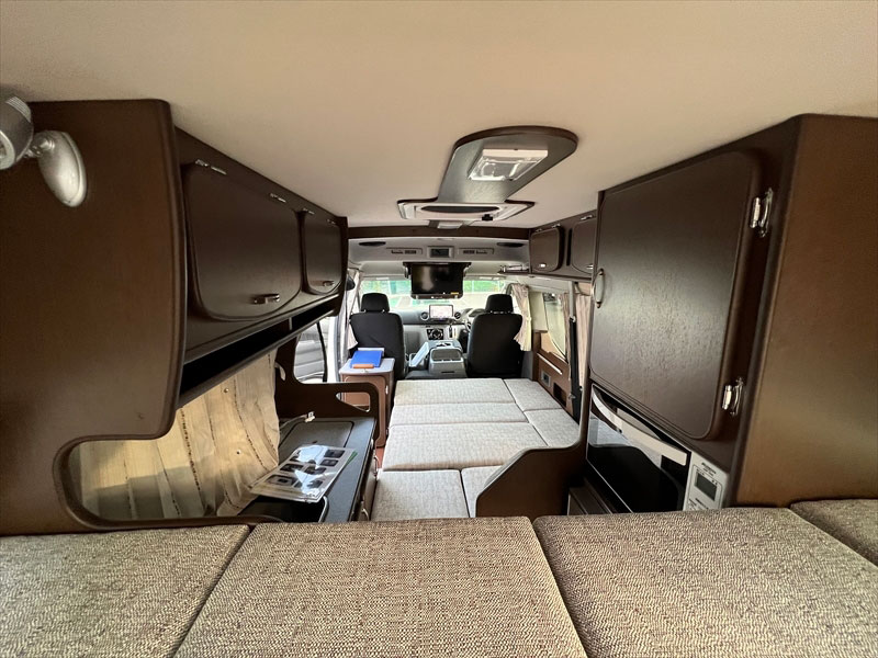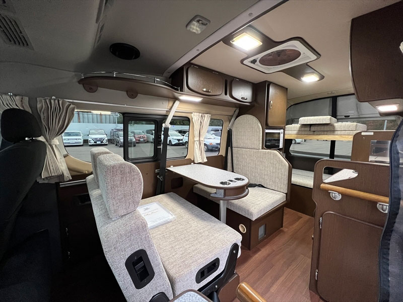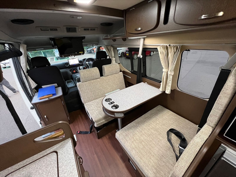 設備【夜間就寢時請務必要每晚連接外部充電】 FF暖器系統 〇 冷凍冷藏冰箱 〇 附簡易馬桶的浴室 × 房間冷氣機 × 多功能房間※1 × 車內100伏特電源插座 〇 淋浴(禁止使用) × 100V便攜式逆變器 × 附飲料架的大型桌子 〇 點煙器USB電源 〇 節能LED照明 〇 所有窗戶配有紗窗和百葉窗 〇 大型排風扇(可在雨天使用) 〇 附電動供水的水槽(冬季不可使用) 〇 電視 〇 車內瓦斯爐 〇 微波爐 〇 三點式安全帶 〇 駕駛座智慧手機支架 〇 倒車攝影機(持續錄影) 〇 多語言導航系統 〇 倒車聲納 〇 AM/FM收音機 〇 側邊遮陽篷(禁止使用) × ETC電子收費系統 〇 行車記錄器 〇 ※1 此空間可用作更衣室或儲物空間,亦可安裝付費的便攜式馬桶。